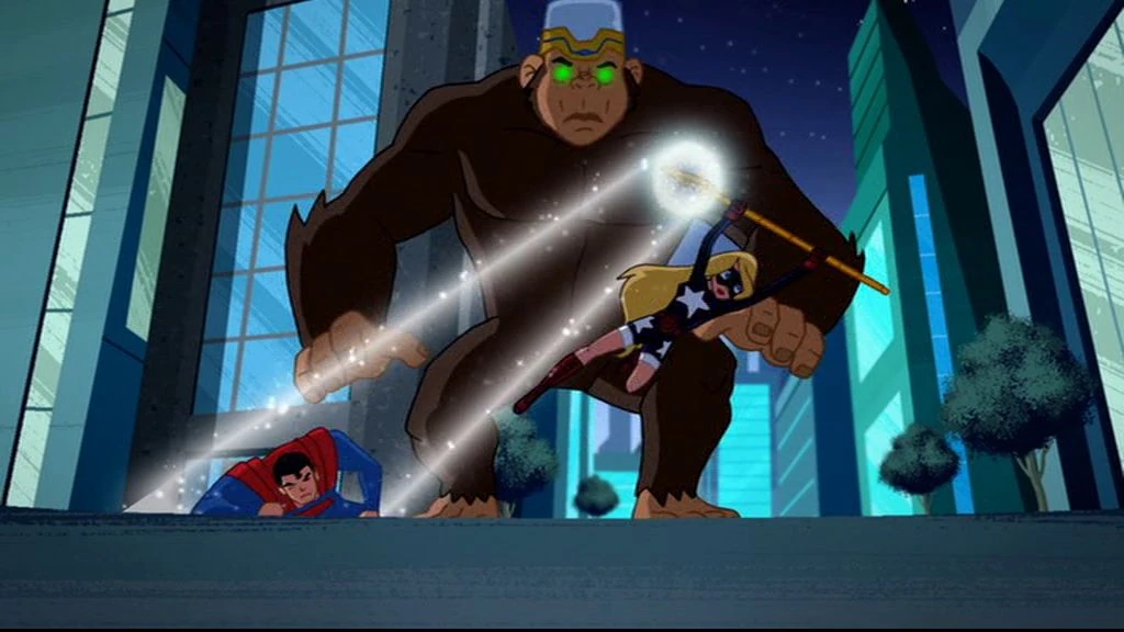 It is night time in the streets of Metropolis and Gorilla Grodd is on the rampage accompanied by the gigantic chimpanzee Titano. Grodd sits on top of the chimp inside a compartment with a canopy, and controls the huge animal against its will through a helmet on his head. Stargirl appears and protects civilians from cars that are hurtling through the air but she has to call on Superman for help. He soon arrives but, at Grodd's command, Titano shoots kryptonite beams from its eyes, and Superman crashes to the ground. Stargirl uses her staff to lift him away to safety before he can be hit again. Recovered, Superman flies away to find a solution to the beams, leaving Stargirl to clear the streets.