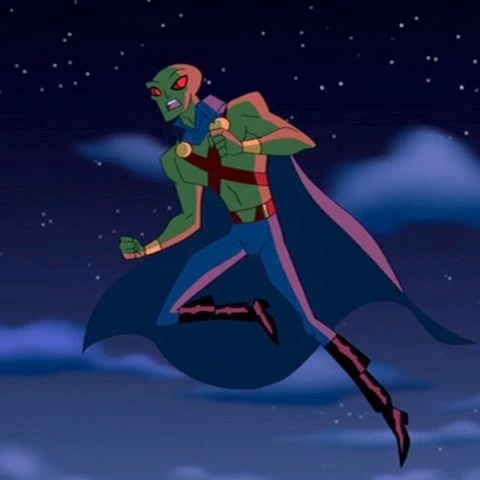 The Martian Manhunter has a humanoid shape and is of medium height with green skin - but this version of him is unusually skinny. He has an elongated head with large, red, typically-alien eyes underneath a prominent brow ridge. He wears the usual blue cape, red belt, and crossed red straps across the chest, but has tight, blue full-length pants with long, black boots. He is softly spoken and good humored. Indeed, he likes to tell jokes but, being naïve about human culture, has to ask if they were funny. Batman calls him "The Martian".