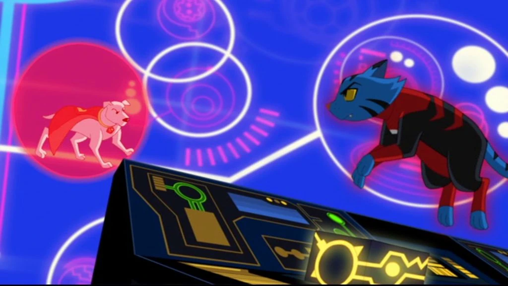 While outside with Krypto, Plastic Man sees a blue cat clinging to some flotsam out to sea. He rescues it and takes it inside to get it something to eat. While he is gone, the cat starts to wander and makes its way to another part of the Watchtower, followed by Krypto. Arriving at the control panel for the Boom Tube, the cat presses a pendant on its collar, causing a projection of Atrocitus to appear. The latter instructs the cat to carry out a plan and, to avoid detection, not to use its power ring. The cat jumps up onto the control panel and initiates a countdown to open a Boom Tube. As Krypto chases the cat away, Plastic Man returns with a cat litter box and cancels the countdown. Blaming Krypto, he takes the cat away to the kitchen.